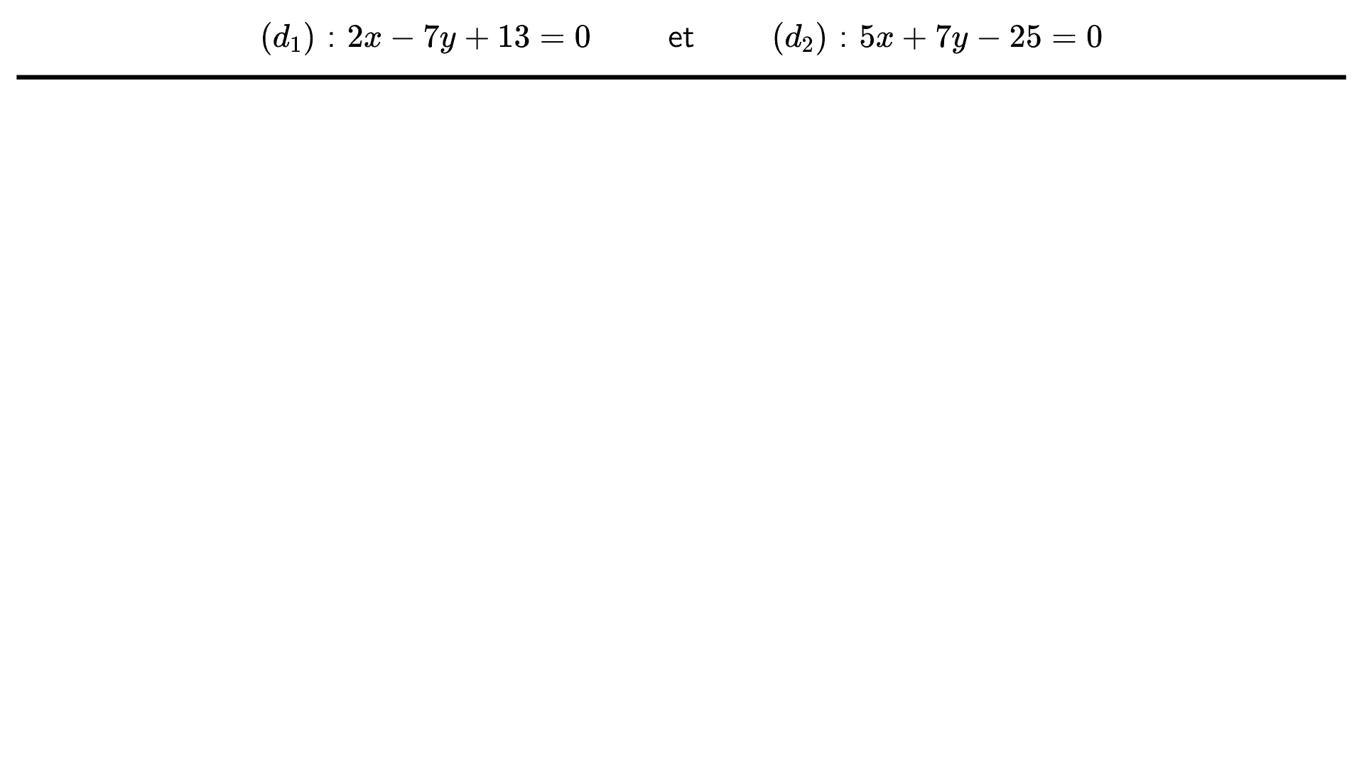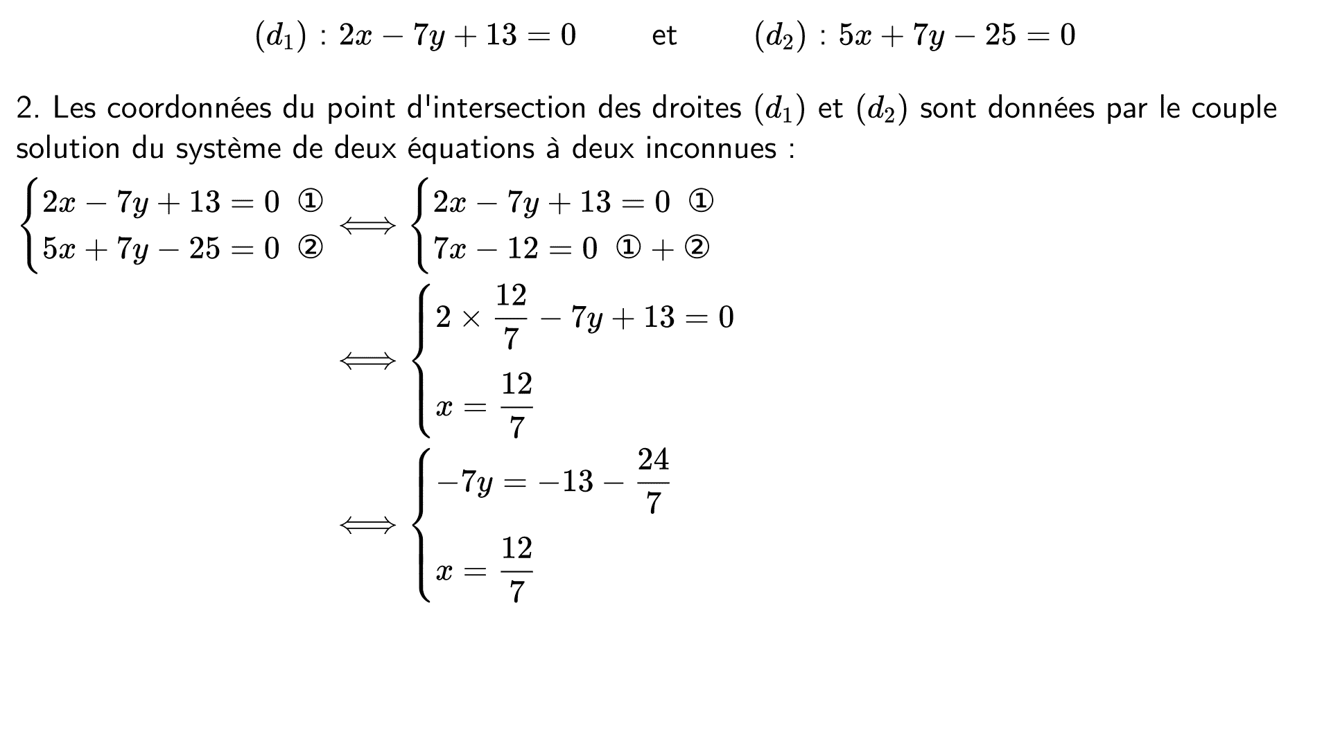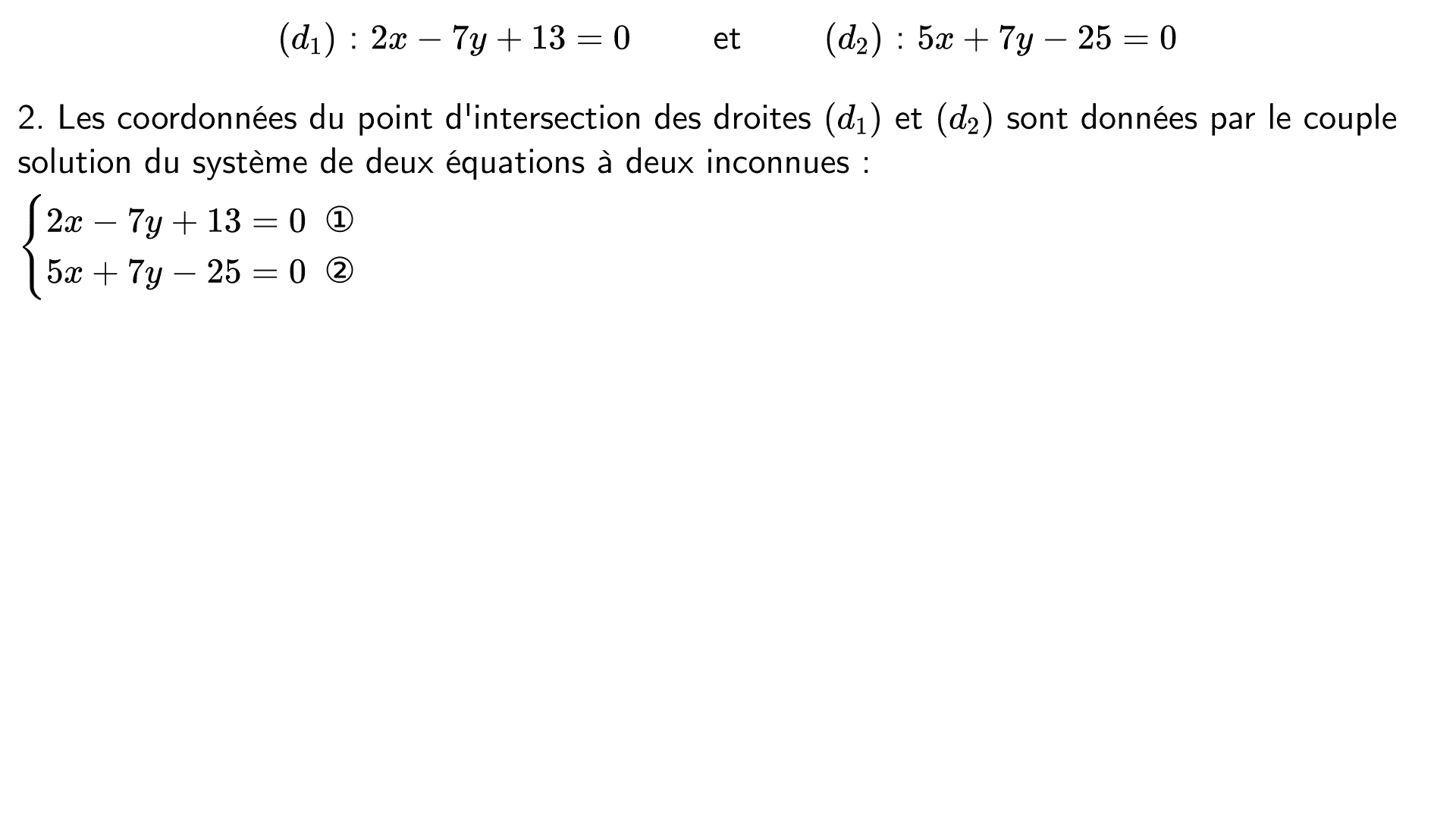 Le plan est muni d'un repère et on considère les droites $(d_1)$ et $(d_2)$ dont voici des équations cartésiennes :
