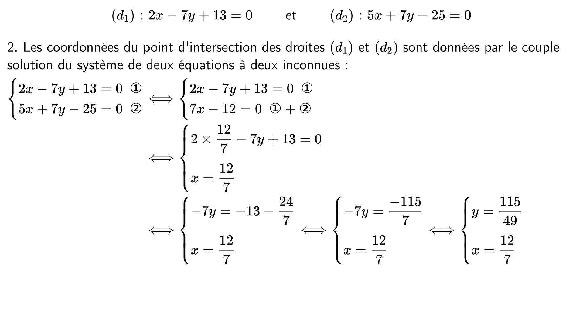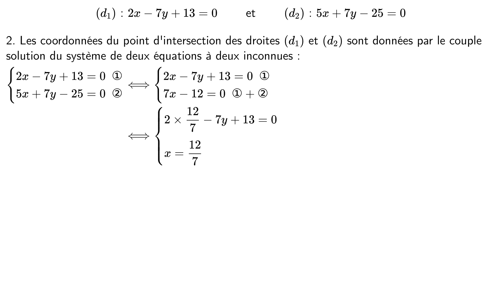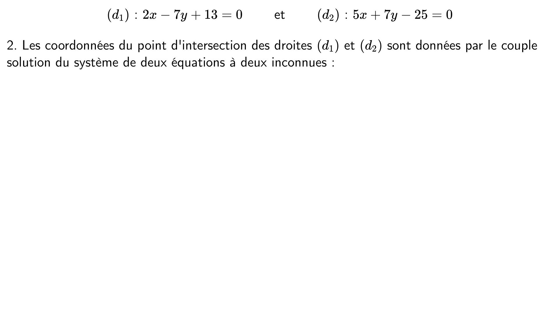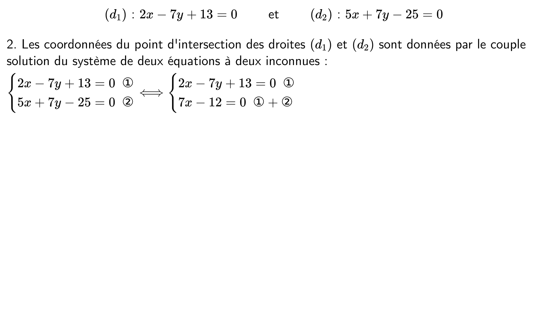 Le plan est muni d'un repère et on considère les droites $(d_1)$ et $(d_2)$ dont voici des équations cartésiennes :