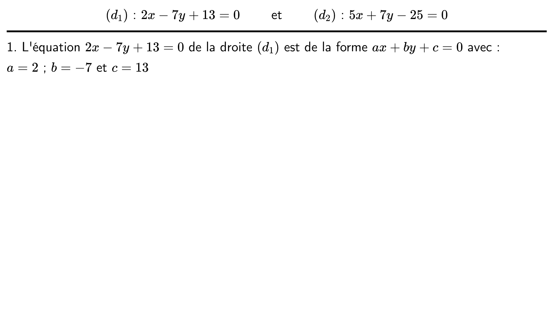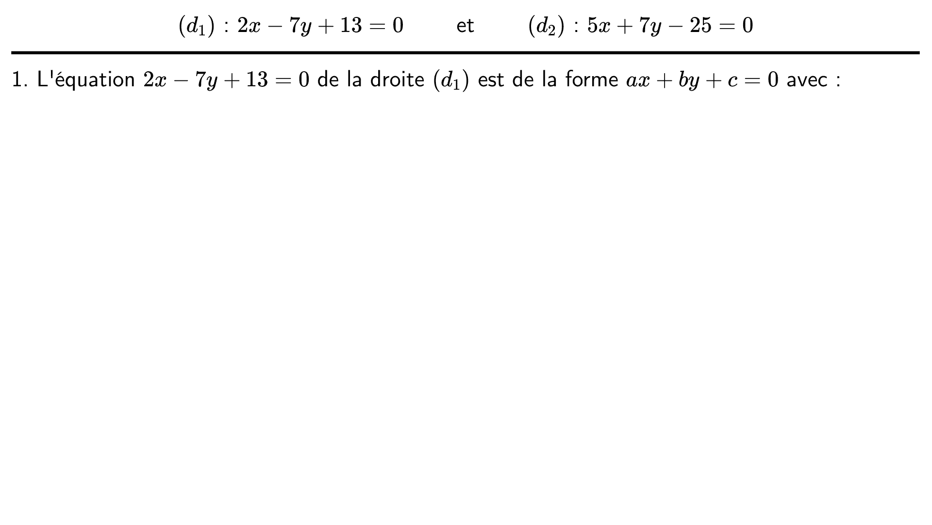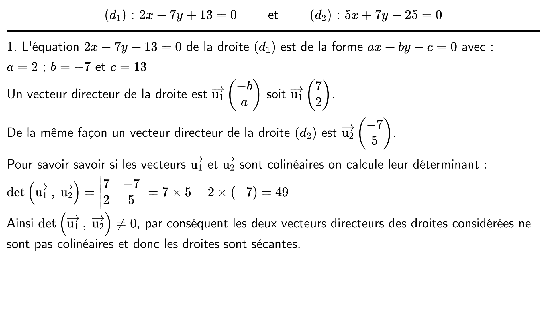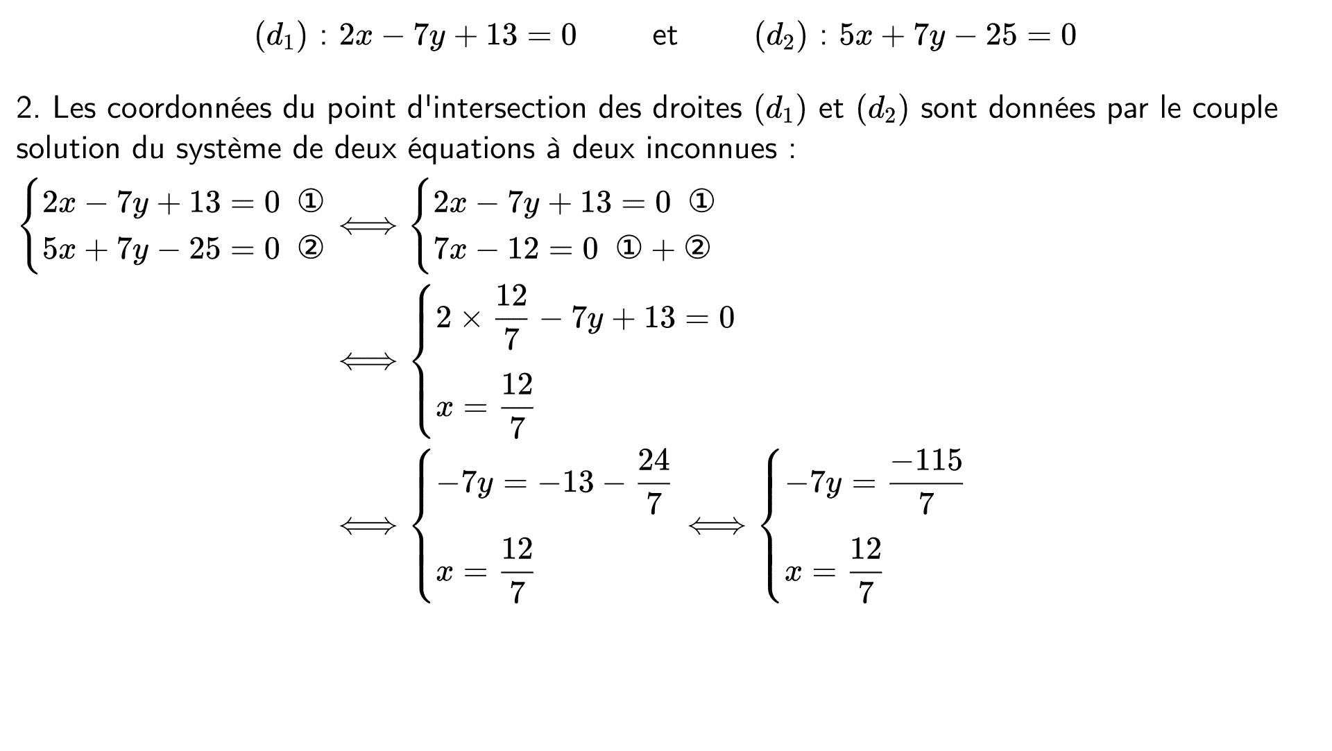 Le plan est muni d'un repère et on considère les droites $(d_1)$ et $(d_2)$ dont voici des équations cartésiennes :